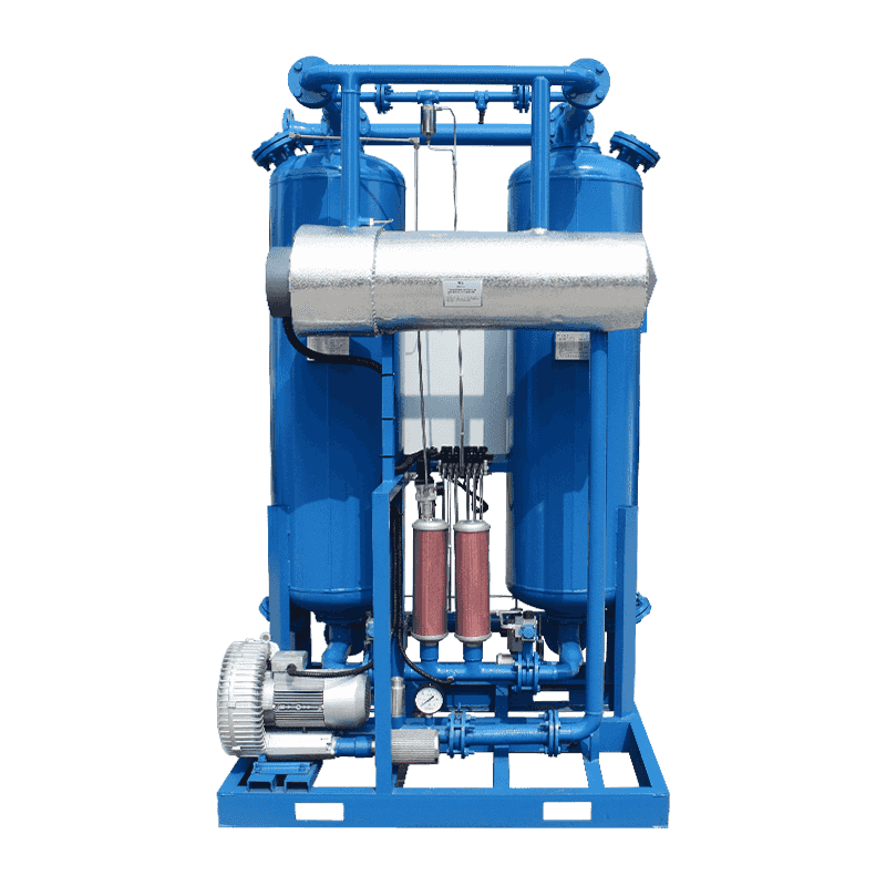 Adsorpcia sušiča adsorpcie s nízkym obsahom plynu patrí do sušiča regenerácie zahrievania. Jeho pracovným princípom je použitie dúchadla na extrahovanie okolitého vzduchu a potom regenerovať sušičku v adsorpčnej veži po zahrievaní, čím sa zabráni strate plynu adsorpčnej sušičky regenerácie mikro-teplom v štádiu zahrievania. Fáza za studena využíva po chladení namiesto časti hotového plynu, čím sa v najväčšej miere ukladá energiu. Je to adsorpčná sušička s účinkom „úspory energie a zníženia emisií“, ktorý zodpovedá národnej politike mojej krajiny. Spotreba regeneračnej energie v sušiči regenerácie zahrievania má dve formy, prvá je tepelná energia potrebná na to, aby adsorbent dosiahol desorpčnú teplotu a odparil vodu, a druhým je plyn používaný ako tepelný nosič a chladiace médium. V sušiči regenerácie výbuchu vykurovania, pretože okolitý vzduch sa používa ako nosič tepelnej energie, spotreba stlačeného vzduchu sa výrazne zníži.